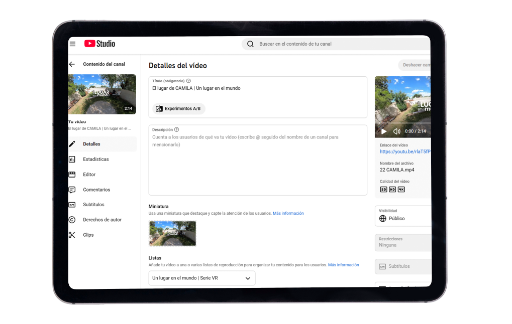 YouTube reconoce automáticamente los metadatos 360° y activa el modo de visualización esférica. El video queda disponible para verse desde cualquier dispositivo — con gafas VR, con smartphone, o desde la computadora.