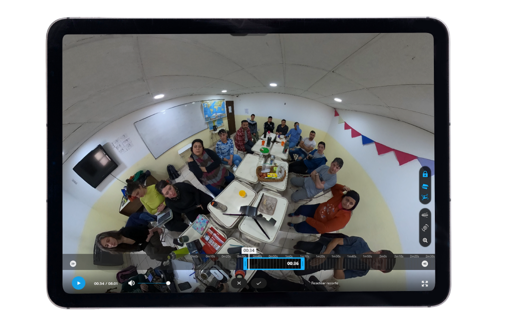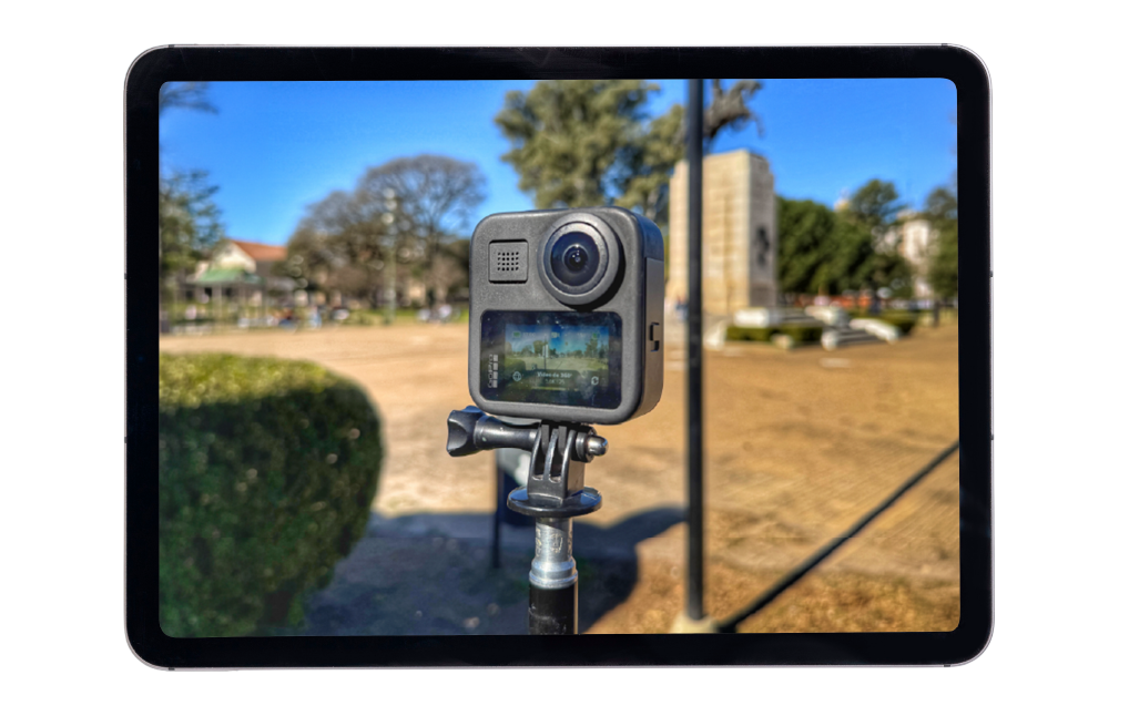 Nosotros trabajamos con la GoPro Max 360° (5.6K, estabilización avanzada, audio espacial con seis micrófonos integrados). Es nuestra recomendación si hay presupuesto: ronda los USD 400–500 y da resultados sólidos en contextos de taller. Una alternativa más económica es la Insta360 GO o cualquier cámara 360° de entrada con dispositivo móvil integrado.
