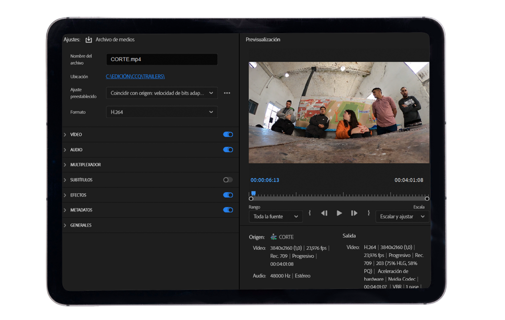 Exportar en H.264 o H.265, resolución 4K o superior, con metadatos 360° activados para YouTube y plataformas de VR.